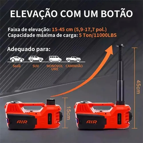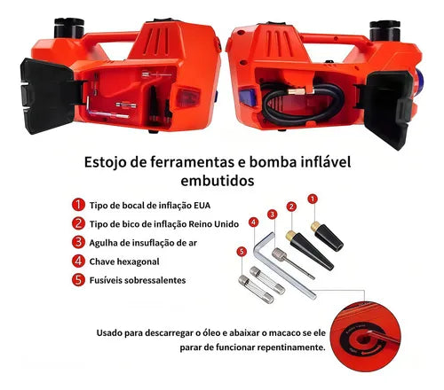 - Kit 3 em 1: macaco elétrico, bomba de ar automática e chave de impacto elétrica.